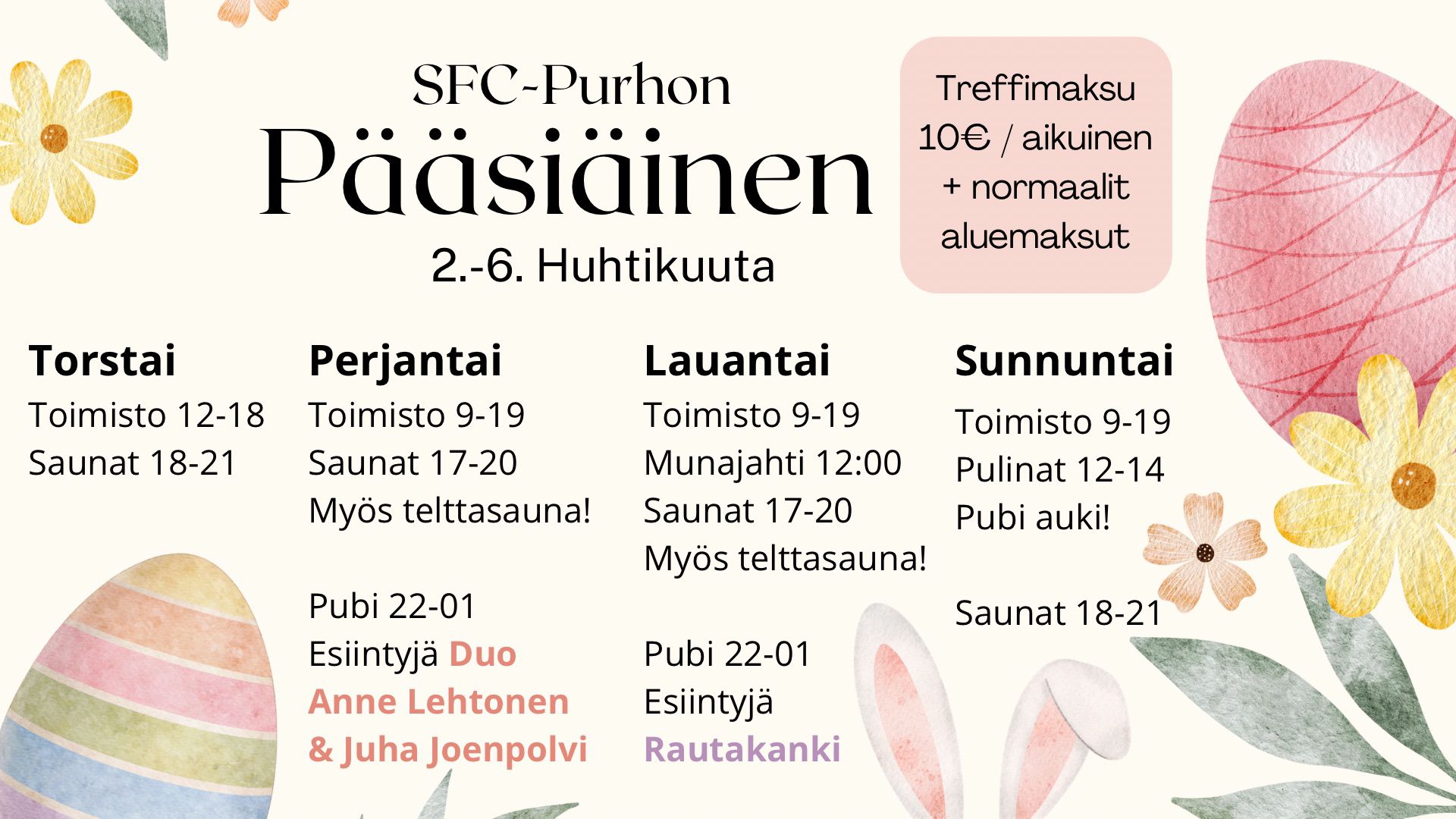 Jos päivystävää aluehoitajaa ei ole alueella, SFC-Purho toimii omatoimisena alueena, jolloin alueen käyttäjät sopivat saunan lämmityksestä sekä siivouksesta keskenään alueen sääntöjen puitteissa. (Vierailijan kannattaa tällöin olla yhteydessä alueen kausipaikkalaisiin). Vierailijoiden leirintä- sekä maksuohjeet toimiston viereisessä keittiössä.